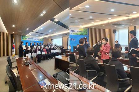 ▲ [사진제공 = 양천구]양천구(구청장 김수영)가 한국환경산업기술원(원장 유제철)과 협업해 지난 2일(수) 양천구청 5층 공감기획실에서 ‘ECO 양천 세이브 키즈존’ 인증서 및 현판 수여식을 개최했다고 밝혔다.