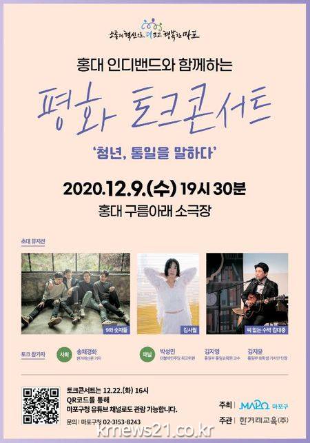 마포구(구청장 유동균)가 9일 홍대 인근 구름아래소극장에서 ‘청년, 통일을 말하다’라는 주제로 평화 토크콘서트를 개최한다고 밝혔다.