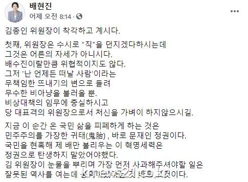신영대 민주당 대변인은 서면 브리핑에서 “즉각 국회의원직에서 사퇴하고 국민과 대통령께 사과하라”며 배 의원의 사퇴를 요구했다.