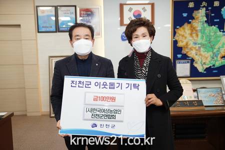 한국여성농업인진천군연합회 김성희 회장과 전영희 차기회장은 8일 진천군청을 찾아 지역의 어려운 이웃을 위해 사용해 달라며 성금 100만원을 기탁했다.