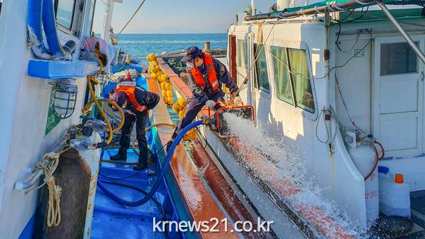 또한 기관실에 배수펌프 3대를 이용 배수 작업을 실시하였고 선박 복원작업을 위해 선박