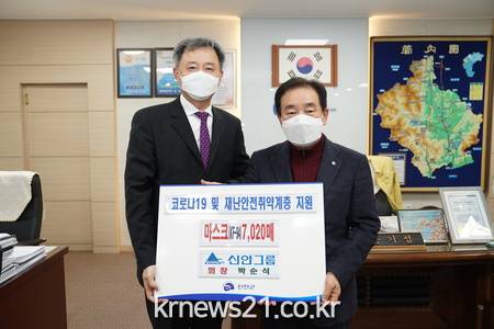 신안그룹(회장 박순석) 이진철 대표이사와 이산원 이사는 10일 진천군청을 찾아 코로나19 대응에 사용해 달라며 600만원 상당의 마스크 7,020매를 기탁했다.