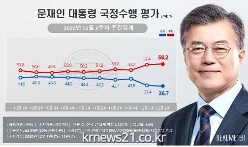리얼미터는 늦어지는 코로나19 백신 접종 계획, 문 대통령의 ‘추미애-윤석열 갈등’ 입장 표명, 더불어민주당의 고위공직자범죄수사처법(공수처법) 개정안 강행 처리, 일부 부처 개각 등이 영향을 미쳤을 것으로 분석했다.