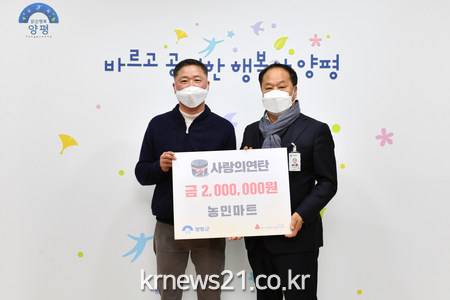▲ [사진제공 = 양평군]지난 11일 농민마트(사장 엄기훈)에서 해피나눔성금으로 200만원을 양평군에 기탁했다. 코로나19가 격상되면서 모두가 어려운 시기에 지역사회의 나눔 문화 확산에 모범을 보여 주었다.