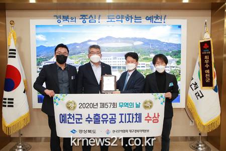 예천군(군수 김학동)이 제57회 무역의 날을 맞아 ‘2020년도 수출유공 지자체’에 선정되는 쾌거를 이뤘다.