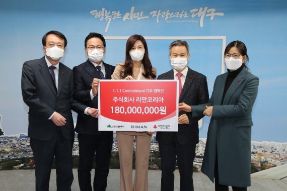 이날 열린 전달식에는 채홍호 대구시 행정부시장, 김경중 ㈜리만코리아 대표이사, 배우 김하늘, 김수학 대구사회복지공동모금회장, 임시아 대구건강가정다문화가족지원센터협회장 등이 함께 했다.