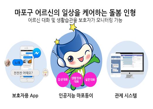 그 밖에 주요 기능은 ▲설문대화 등 치매예방 콘텐츠 ▲인공지능 기술(머신러닝, 딥러닝)을 이용한 개인별 맞춤형 서비스(약복용 시간, 기상 및 취침, 날씨 등) ▲활동감지 등 안전관리 모니터링을 통한 비상상황 응급 연계 ▲마포구 행정 및 복지소식 알림 등이다.
