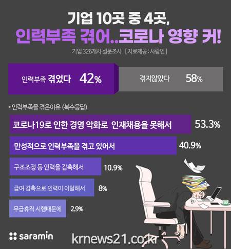 구인구직 매칭플랫폼 사람인(대표 김용환)이 기업 326개사를 대상으로, ‘2020년 채용 결산’을 주제로 조사한 결과, 42%가 올해 인력부족을 겪었다고 답했다.