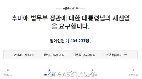 한편, 추 장관의 재신임을 촉구하는 청와대 국민청원은 29일 9시 30분 현재 40만 명의 동의를 얻으며 청와대 답변 기준을 충족했다.