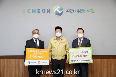 ▲ [사진제공 = 이천시]28일 동원대학교(총장 이걸우) CEO과정 총원우회(회장 정승달, 이하 총원우회)에서 성금 3백만 원, 무궁화복지월드 이천봉사단(단장 김유성, 이하 이천봉사단)에서 성금 5백만 원을 이천시 저소득층을 위해 사용해 달라고 기탁하였다.
