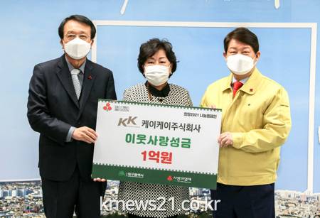 케이케이주식회사(대표이사 박윤경)는 28일 오전, 대구시청에서 권영진 대구시장, 박윤경 케이케이주식회사 대표이사, 김수학 대구사회복지공동모금회장 등이 참석한 가운데 이웃돕기 성금 1억원을 대구사회복지공동모금회에 전달하며 ‘희망2021 나눔캠페인’에 동참했다.