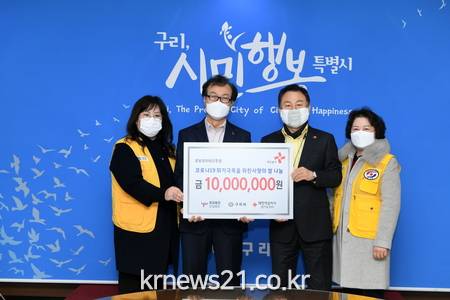 구리시(시장 안승남)는 30일 시청 민원상담실(3층)에서 이웃사랑과 기부문화 확산을 위해 (주)로보큐브테크(대표이사 김영석), 적십자사 경기도지사 동북봉사관(관장 허정구), 대한적십자사봉사회 구리지구협의회(회장 함정현)를 비롯한 관계자 10명이 참석한 가운데 작년에 이어 올해에도 지정기부금 일천만원과 2021년도 특별회비 일천만원을 전달했다.