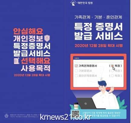 ▲ [사진=홍보포스터]2020년 12월 28일부터 대법원 규칙에 의거 가족관계, 기본 및 혼인증명서를 발급할 때 신청인이 사용목적에 따라 필요한 정보만 선택하여 불필요한 정보를 공개하지 않는 제도 ‘특정증명서 발급 서비스’를 확대 시행한다.