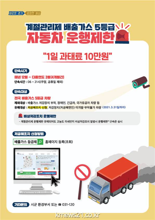도 관계자는 “계절 관리제 운행제한 시행과 코로나19 확산 등으로 지난해 12월 경기도 초미세먼지(PM2.5) 농도는 평균 28.7㎍/㎥으로 2019년 12월보다 약 7.7% 감소했다”며, “미세먼지로부터 안전한 경기도를 만들기 위해 노후경유차 소유자들은 조속히 배출가스 저공해조치를 신청해 줄 것을 당부드린다.”고 말했다.