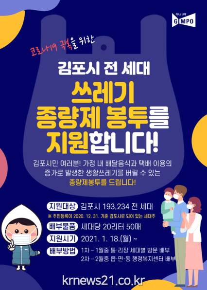 정하영 김포시장은 “코로나19 장기화에 따른 시민 여러분의 부담을 조금이라도 더 덜어드리기 위해 종량제봉투 무상지급을 결정했다”면서 “투병 페트병 분리수거 등 자원재활용에도 적극 동참해 달라”고 당부했다.