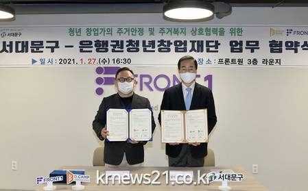 ▲ [사진제공 = 서대문구]서대문구가 스타트업(창업초기기업) 청년들의 주거 안정을 위해 1월 27일 오후 마포구 공덕동 소재 ‘프론트원(FRONT1)’ 3층 라운지에서 (재)은행권청년창업재단(센터장 김홍일)과 업무협약을 맺었다.