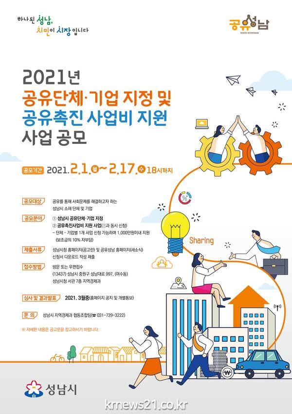 성남시는 나눠 쓰는 문화 확산을 위해 오는 2월 17일까지 공유 기업·단체와 촉진 사업을 공모한다.