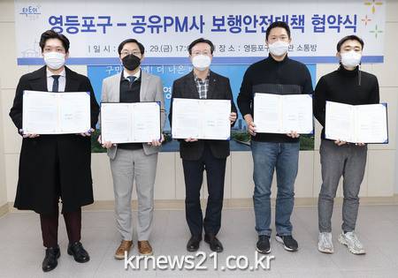 채현일 영등포구청장은 29일 오후 구청 본관 3층 소통방에서 구에 소재한 퍼스널 모빌리티 공유서비스 업체 4곳의 대표들과 전동 킥보드 보행안전대책 확립을 위한 협약서에 서명하는 시간을 가졌다.