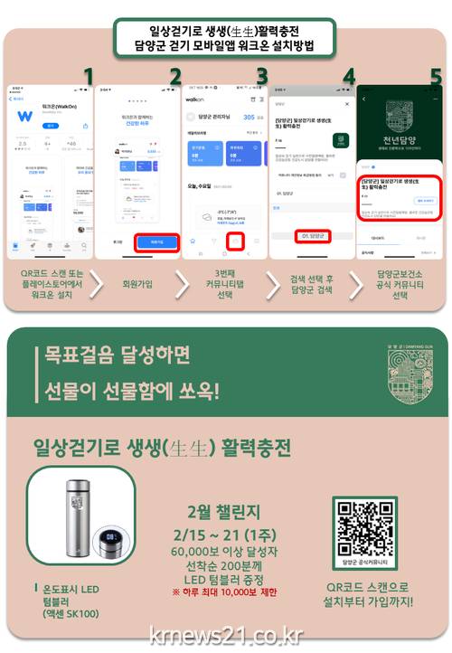 가입은 안드로이드 스마트폰 플레이스토어에서 ‘워크온’을 검색하거나 QR코드 스캔을 통해 앱을 설치하고 담양군 공식 커뮤니티를 선택한 후 가입하면 된다.