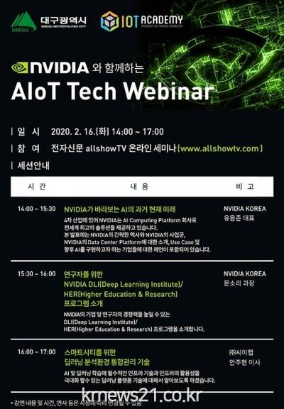 ▲ [사진=홍보포스터]대구시는 인공지능(AI), 사물인터넷(IoT), 스마트시티 분야의 최신 기술 동향을 지역에 공유하고 신기술 개발 및 기업성장을 촉진하기 위하여 16일 ‘엔비디아(NVIDIA)와 함께 하는 AIoT Tech Webinar’를 개최한다.