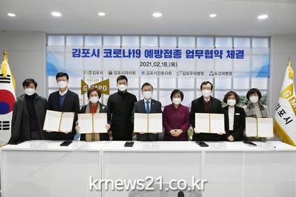 김포시가 18일 김포시의사회, 김포시간호사회 등 의료단체, 김포우리병원, 뉴고려병원 등 의료기관과 코로나19 예방접종 업무협조 협약을 체결했다.