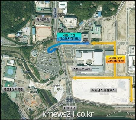 이번 개통구간은 엑스포과학공원 내 지하차도 구간이며, 사이언스 콤플렉스로 이어지는 일부도로는 올 8월 사이언스콤플랙스 준공 시점에 개통예정으로 지하차도 이용시민에게 안전운행 당부와 도로 이용에 협조를 드린다고 대전시 관계자는 전했다.