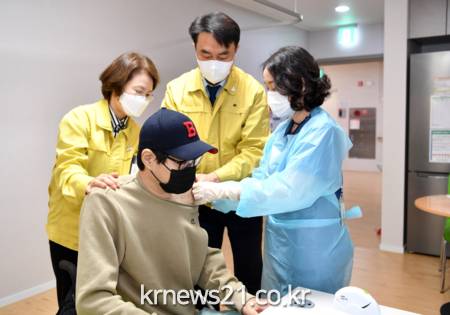 김 시장은 첫 접종을 받은 시민에 응원의 메시지를 전하고, 의료진과 종사자에게는 격려를 표했다.