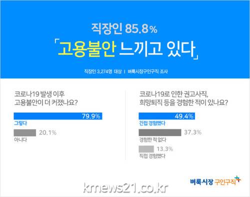 직장인들의 고용 불안감은 코로나19 발생 이후 더욱 커진 것으로 조사됐다. 설문에 참여한 응답자 중 79.9%가 코로나19 이후 고용 불안이 더 커졌다고 답했으며 코로나19로 인한 권고사직, 희망퇴직 등 구조조정을 직·간접적으로 경험했다고 답한 응답자도 62.7%에 달했다.