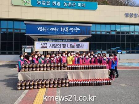 한국생활개선영양군연합회는 2007년부터 회원들이 직접 준비한 메주를 십시일반 모아 사랑이 가득 담긴 장을 담그고, 1년 동안 항아리에서 잘 숙성된 된장, 간장을 용기에 담아 관내 취약 계층 150여 곳으로 읍면 회원들이 나눔 배달을 하면서 따뜻한 사랑을 실천해 오고 있다.