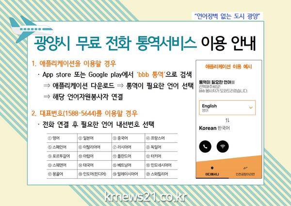 후원하는 언어를 선택하고 통화버튼을 누르면, 즉시 무료 통역서비스를 받을 수 있으며 광양