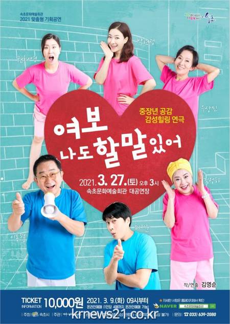 속초시가 3월 27일 토요일 오후 3시 속초문화예술회관 대공연장에서 속초문화예술회관 2021년 첫 기획공연으로 중장년 공감 연극『여보 나도 할말 있어』를 개최한다.