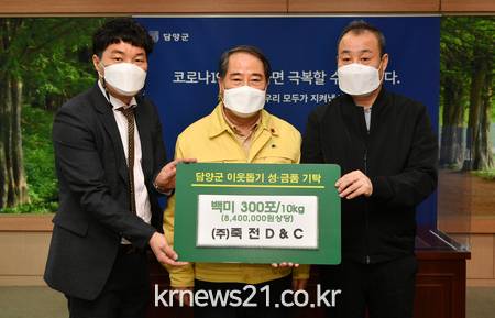 ▲ [사진제공 = 담양군]담양군(군수 최형식)은 ㈜죽전D&C에서 이웃을 위해 써달라며 백미 10kg 300포(840만원상당)을 기탁했다고 5일 밝혔다.