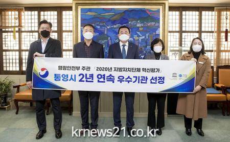 전국 243개 지방자치단체를 대상으로 실시한 지방자치단체 혁신평가는 자율혁신, 포용적 행정, 참여와 협력, 신뢰받는 정부, 혁신확산·국민체감 등 5개 분야 12개 지표를 심사하였고, 통영시는 기관장의 혁신리더십 및 적극행정 활성화 등에서 좋은 평가를 받아 2019년에 이어 2년 연속 우수기관으로 선정, 행정안전부로부터 특별교부세 8천만원을 지급받게 되었다.