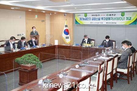 예천군은 12일 오전 11시 군청 중회의실에서 김학동 예천군수를 비롯한 강진욱 옥토산업(주) 대표 등이 참석한 가운데 제2농공단지 투자양해각서(MOU)를 체결했다.