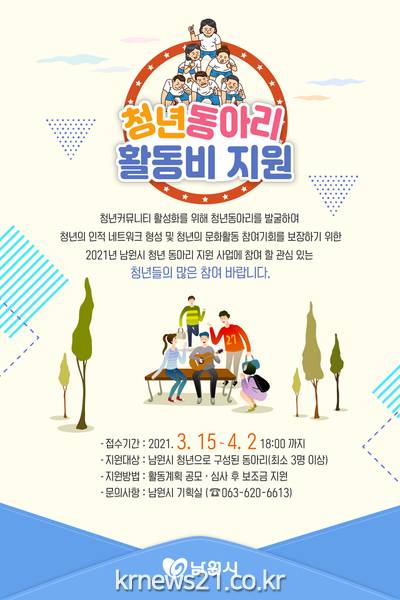 시 관계자는 “청년들의 의견수렴을 통해 이루어진 사업으로 「2021년 남원시 청년동아리 지원 사업」을 통해 사회적 네트워크를 조성할 수 있는 기회를 제공하여 정서적 지지망을 형성할 수 있도록 도움으로써 청년들에게 심리적 여유을 제공하고, 활발한 사회활동을 할 수 있는 마중물 역할을 함으로써 남원시 청년사회가 좀 더 활력 있게 움직일 수 있는 계기가 되기를 기대 한다”고 말했다.