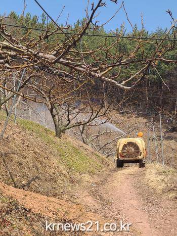 ▲ [사진제공 = 진주시]진주시는 관내 배, 사과 재배 농가(375농가 230ha)를 대상으로 과수화상병 방제 약제를 전량 무상으로 공급한다고 16일 밝혔다.