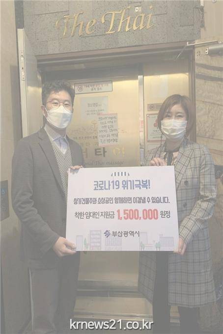 ▲ [사진제공 = 부산시]부산시(시장 권한대행 이병진)는 코로나19 영향으로 경영난을 겪고 있는 소상공인의 임대료 부담경감을 위해「부산시 착한 임대인 지원사업」을 2월 15일부터 본격적으로 시행하여 첫 지원금(30건 6,800만 원)을 시작으로 3월부터 착한 임대인에 대한 지원금을 본격 지급 개시했다고 밝혔다. 현재까지 착한 임대인 신청자는 281명에 임차인은 562명이다.