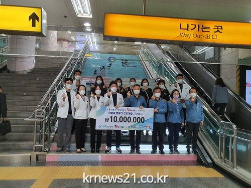 ▲ [사진제공 = 대구도시철도공사]대구도시철도공사와 푸른청신경과의원(원장 양준규)은 지난 19일(금) 2호선 신매역에서 멜로디 건강기부계단을 통해 적립된 기부금 1천만 원을 삼성서울병원 소아암센터에 기부하는 전달식을 가졌다고 밝혔다.