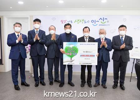 ▲ [사진제공 = 안산시](재)안산인재육성재단(이사장 윤화섭)은 24일 재단 이사회 임원과 농협중앙회 안산시지부로부터 기부금 1억 원을 기탁 받았다.