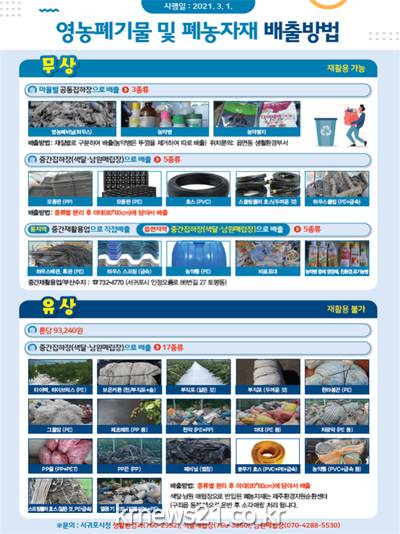 반면, 영농폐비닐, 농약병, 농약봉지 3가지 품목은 마을별 공동집하장(80개소 : 읍면동사무소 문의)에 배출하면 수거․처리된다.