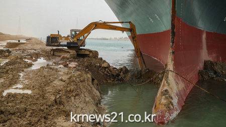 좌초한 배를 운하에서 빼내기 위한 준설과 예인 작업은 26일까지 나흘째 계속됐지만, 뱃머리가 제방에 박힌 거대한 선박을 물에 띄우는 작업이 쉽지 않은 상황이다.