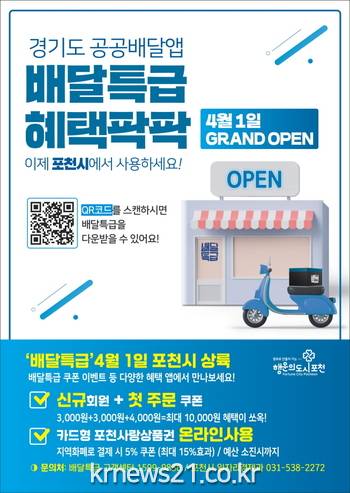 한편, 시는 배달특급 정식 오픈을 기념해 ‘4월의 크리스마스 이벤트’를 진행 한다. 4월 1일부터 30일까지 배달특급 가입자 중 1회 이상 지역화폐로 결제한 소비자 61명을 추첨해 1등 30만 원(1명), 2등 10만 원(20명), 3등 5만 원(40명)권의 포천사랑상품권을 증정하고, 선착순 1,000명에게 5,000원 할인쿠폰을 지급한다.