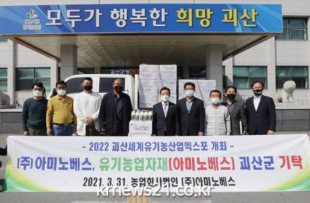 이날 군청현관 앞에서 열린 기증식에는 이차영 괴산군수를 비롯해 권구영 유기농업인연합회 회장, 한신철 ㈜아미노베스 대표 등 6명이 참석했다.