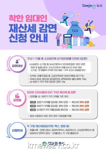 대전시 임재진 자치분권국장은“코로나19의 장기화로 어려움을 겪고 있는 납세자들의 경제적 위기상황에 조금이나마 도움이 될 수 있도록 지방세 감면을 적극 시행하겠다”고 말했다.