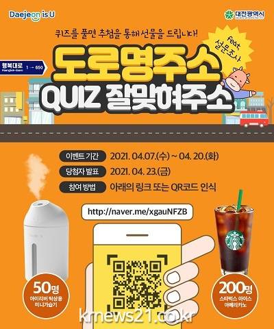 퀴즈는 도로명주소와 관련된 3문항으로 구성되며, 대전시 홈페이지, 블로그, SNS(페이스북, 인스타그램 등)의 ‘도로명주소 퀴즈 잘맞혀주소’ 배너와 QR 코드를 인식해 누구나 참가할 수 있다.