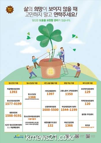 이에 장성군보건소는 자살예방상담전화(1393) 안내 현수막 게첨 및 및 ‘도움기관정보’ 포스터 배부 등을 통해 자살 예방 홍보활동을 강화하고 있다. 읍·면 보건지소에 생명지킴이 양성 교육을 실시해 자살 위기자를 발굴할 수 있는 역량도 강화할 방침이다. 또한 자살 고위험군 군민을 대상으로 지속적인 안부 확인과 상담 등 밀착관리를 실시한다.