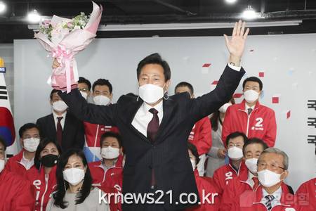 오 후보는 당선이 확정된 이날 오전 0시10분쯤 서울 여의도 당사를 찾아 당선인사를 했다. 그는 "엄중한 책임감을 주체할 수 없다"며 "다시 일할 기회를 주신 것은 산적한 문제를 능수능란하게 해결하란 지상명령으로 받들겠다"고 소감을 전했다.