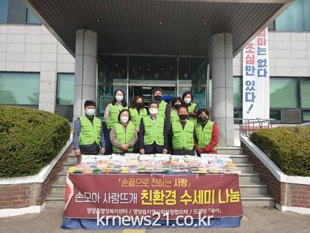 ▲ [사진제공 = 영양군]영양읍지역사회보장협의체(공동위원장 김상준, 정휘대)는 4월 6일 영양읍행정복지센터에서 수세미 160점을 지역 취약계층에게 나누는「손모아 사랑뜨개 나눔 행사」를 개최하여 따뜻한 이웃사랑을 실천했다.
