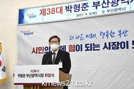 끝으로 위대한 부산시민과 함께 혁신의 거대한 물결로 부산의 새로운 미래를 열 것을 약속하며 취임사를 마쳤다.