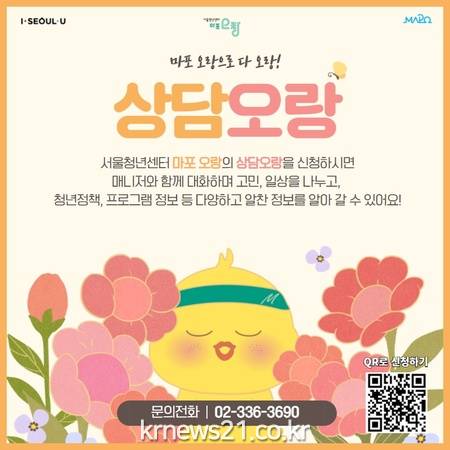 ▲ [사진=홍보포스터]마포구(구청장 유동균)가 청년의 고민 상담, 사회적 관계망 형성 등을 원스톱으로 지원하기 위해 조성한 ‘서울청년센터 마포 오랑’이 4월부터 본격적인 프로그램 운영에 나섰다.